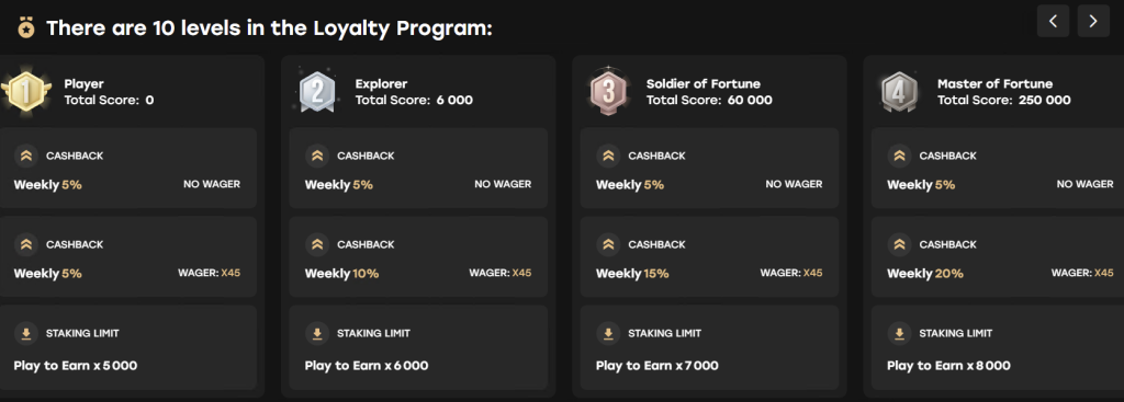Tryggðarstigi okkar er ekki bara fallegt nafn á vefsíðu; það er raunveruleg leið að verulegum fjárhagslegum ávinningi og einkaréttarþjónustu. Forritið samanstendur af 10 vandlega ígrunduðum stigum, allt frá byrjendastigi „Explorer“ upp í hið goðsagnakennda og eftirsótta „Platinum Card“ stig. Hvert stig er hægt að ná með virkum leik og söfnuðum TFS-tóknum.